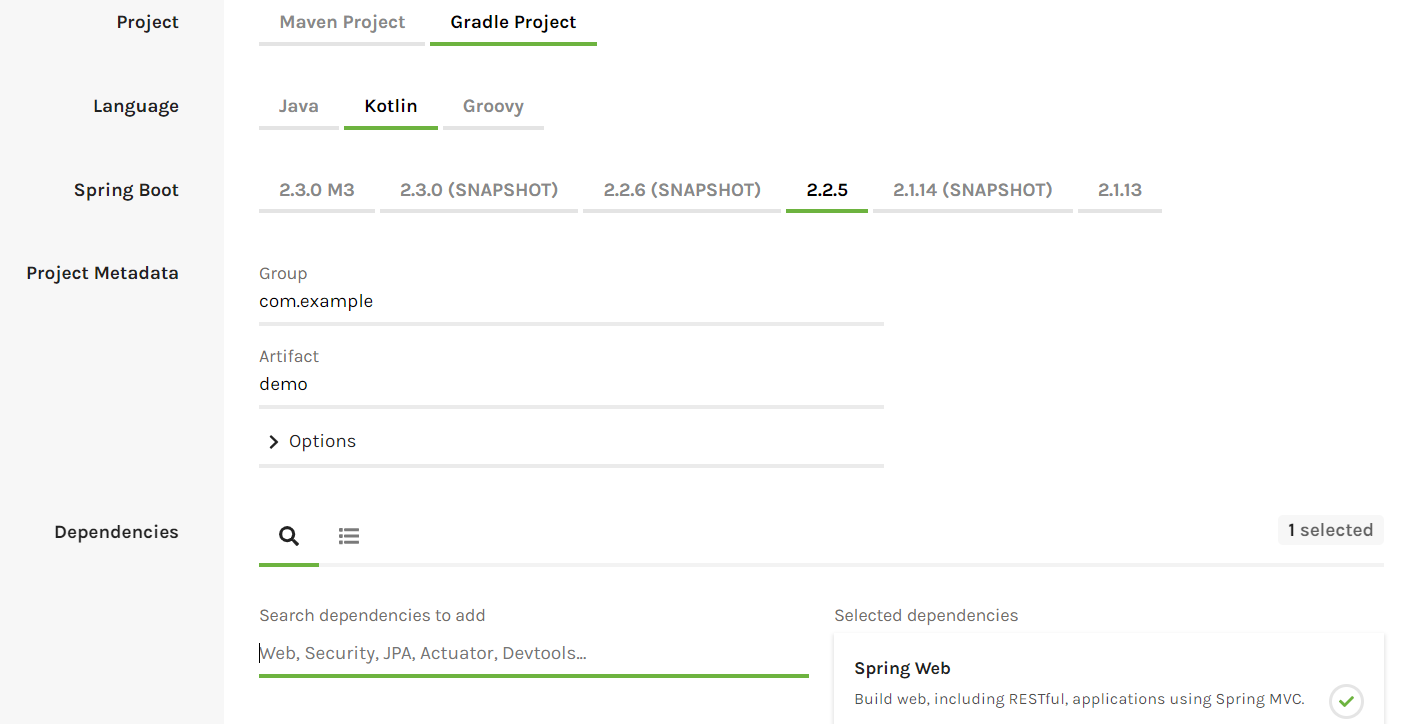 2. 위에 사이트에서 dependency를 추가하여 기본 뼈대 프로젝트 생성