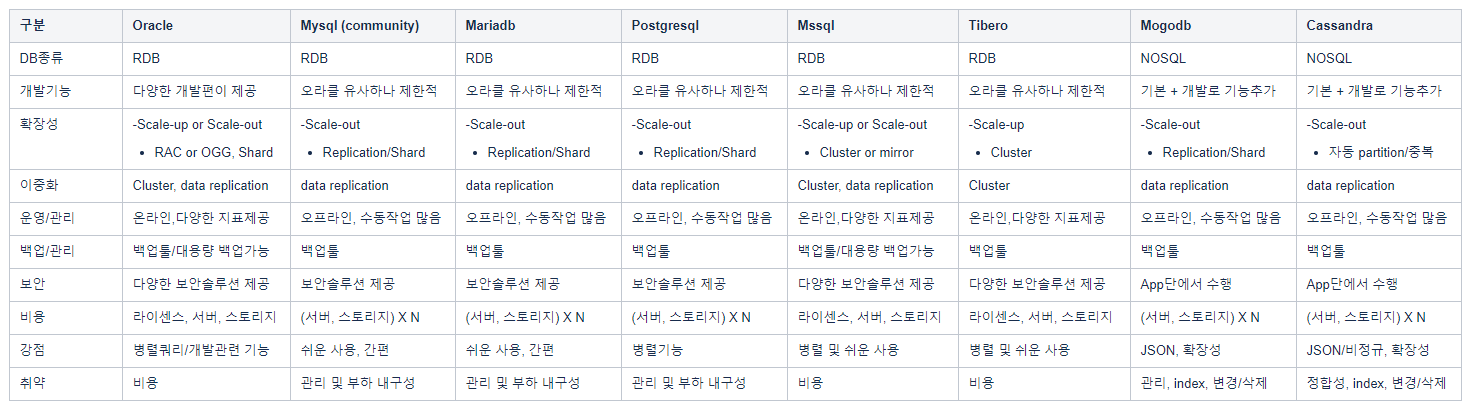 개인적인 기준으로 작성한 DB 비교 기준입니다.
