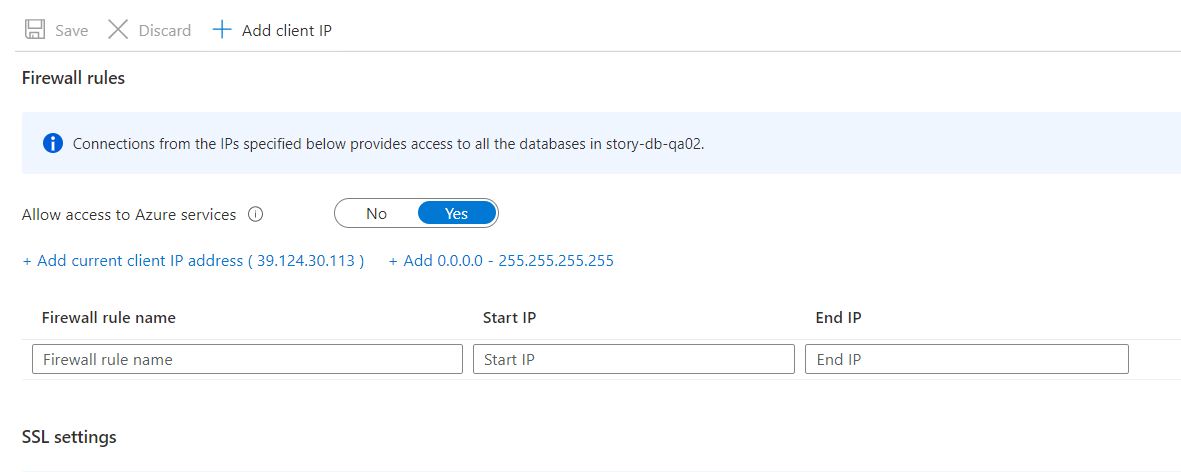 아래 화면중 Allow access to Azure services를 선택하던가, 접속할 client ip를 아래 firewall rule에 추가