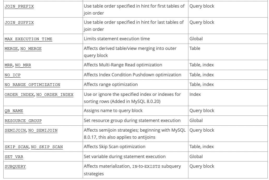| MySQL 8.0 Hint for Query block (0) | 2023.06.22 |